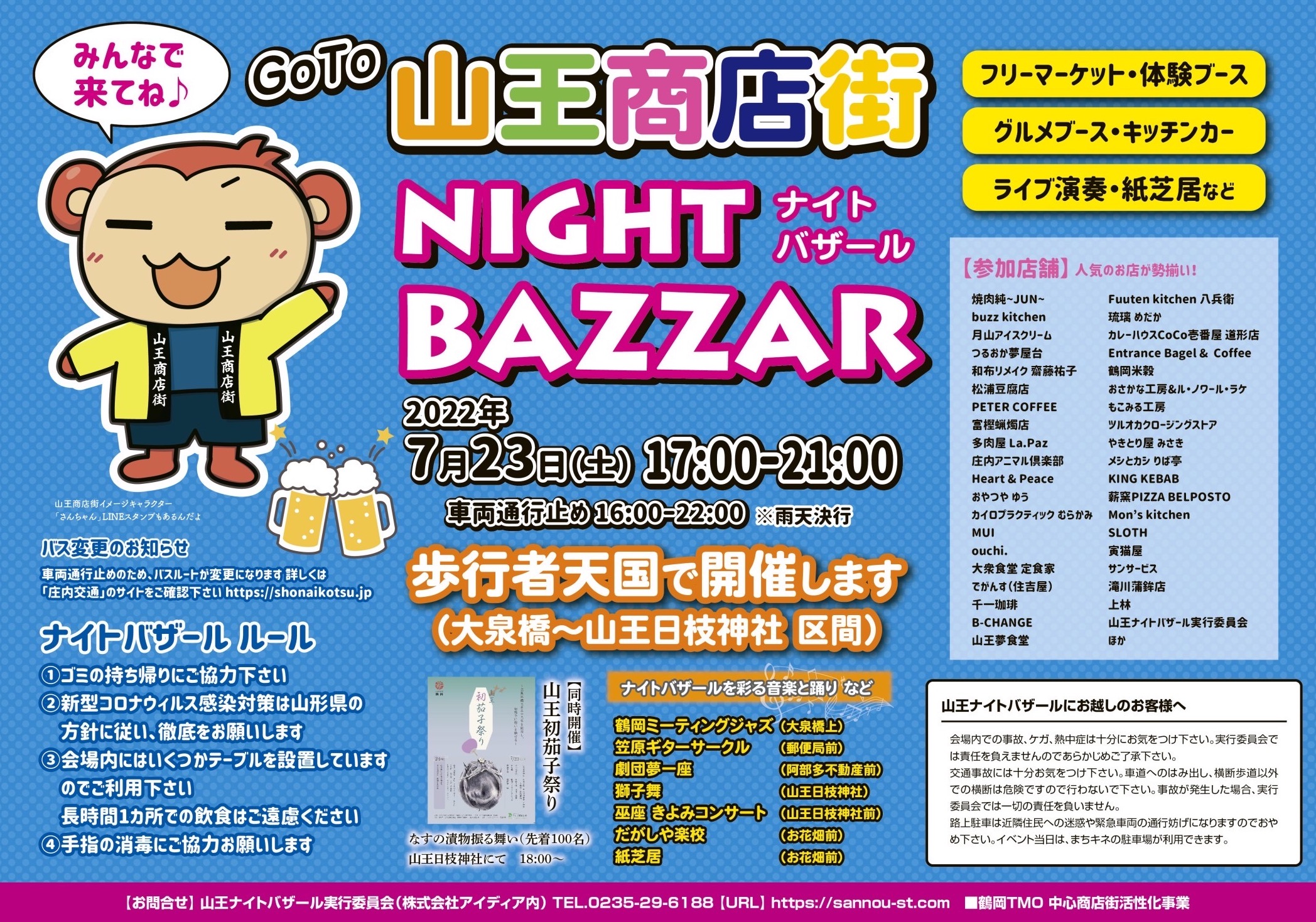 7月23日(土)、山王ナイトバザールが3年振りに開催されます。16:00〜22:00は車両通行止めになります。準備のできたお店から順次オープンします。